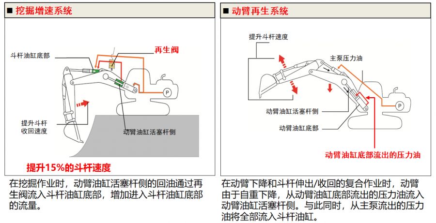 這個(gè)系統(tǒng)簡(jiǎn)單理解就是,當(dāng)我們挖機(jī)在做下挖的復(fù)合動(dòng)作時(shí),機(jī)器借助大臂下降的力量把大臂里面的液壓油直接壓到小臂油缸,這樣小臂速度反應(yīng)更快,而其他品牌的車(chē)都是回到液壓油箱里,再經(jīng)過(guò)大泵輸送到小臂油缸。日立挖機(jī)通過(guò)獨(dú)特技術(shù),節(jié)省了很多輸出能量,同時(shí)也縮短小臂的收回時(shí)間,這就是提能增效,減耗省油的原因。
