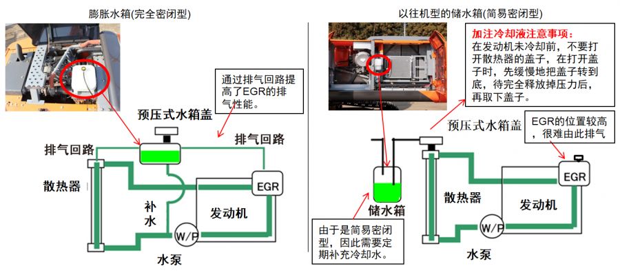 以前水箱在側(cè)面,現(xiàn)在水箱放在發(fā)動(dòng)機(jī)上面,俗話講人往高處走,水往低處流,這樣的設(shè)計(jì)有利于發(fā)動(dòng)機(jī)隨時(shí)補(bǔ)水,及時(shí)排氣,保持發(fā)動(dòng)機(jī)恒溫狀態(tài),有效提升降溫性。